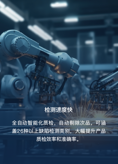 全自動(dòng)智能化質(zhì)檢,自動(dòng)剔除次品,可涵蓋26種以上缺陷檢測(cè)類別,大幅提升產(chǎn)品質(zhì)檢效率和準(zhǔn)確率。