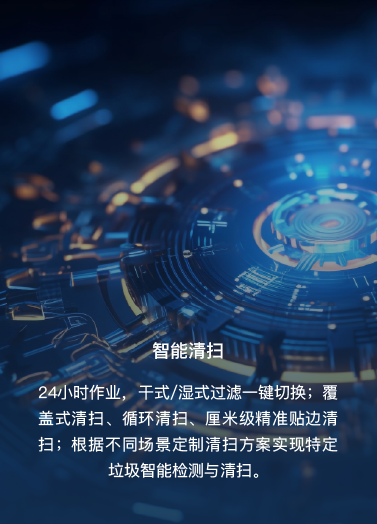 24小時作業(yè),干式/濕式過濾一鍵切換;覆蓋式清掃、循環(huán)清掃、厘米級精準貼邊清掃;根據(jù)不同場景定制清掃方案實現(xiàn)特定垃圾智能檢測與清掃。