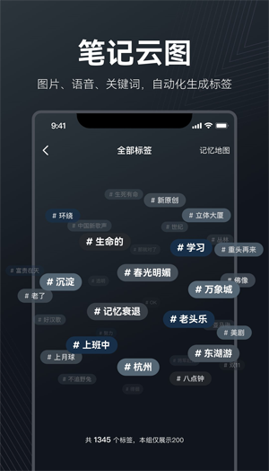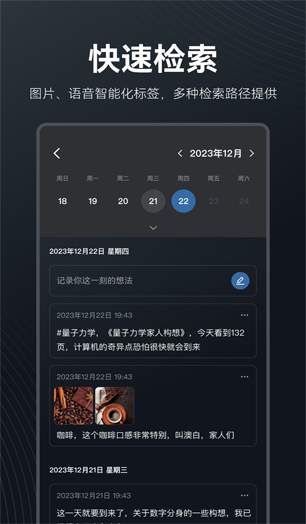 支持語音和語義查詢某天某時刻的記憶細節(jié):通過語音和語義查詢技術,方便用戶快速查找和使用自己的記憶細節(jié)。 - 語音、圖片筆記自動化標簽,生成符合用戶習慣和喜好的標簽 - 筆記和日歷聯(lián)動查詢 - 支持快速查詢
