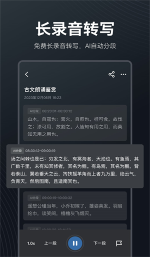 長達24小時不間斷的長錄音轉寫,支持智能分段、聲紋識別、各種場景識別的多種AI算法